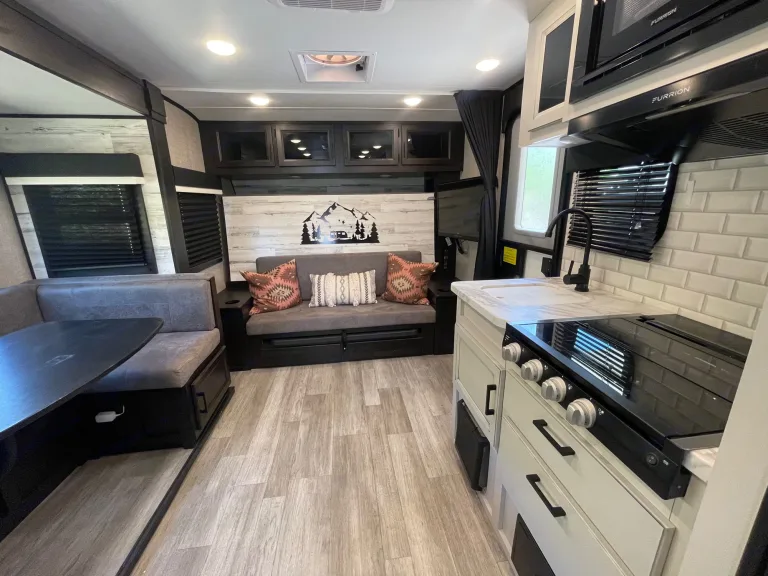 10. Comes with weight distribution / sway limiting hitch.*Gas generator available as a $50 add-on. (Full tank of gas included).Interior Features:1. Living space. There is 3-4 person sofa seat with built-in cup holders.