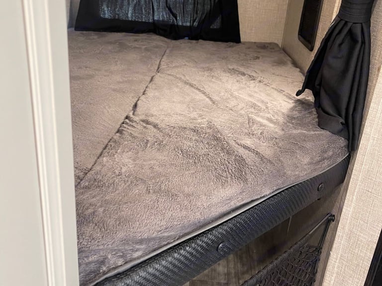 3. Sleeping space. There is queen size murphy bed in the front with privacy curtain. There is a full size double bunk (2-beds), privacy curtain, light, and USB charging port in each bunk. Dinette converts to bed (comfortable for two children or one adult).
