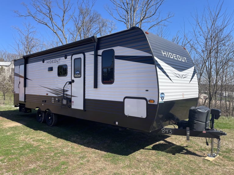 Welcome to your ultimate mobile getaway! Say hello to our fantastic travel trailer – your ticket to adventure and relaxation all rolled into one sleek package!**Sleeps 10 in Style**: Bring the whole crew, and then some! Our spacious travel trailer ensures that everyone has a cozy spot to lay their heads, making it the ideal choice for family reunions, group getaways, or those times when you just want to bring everyone along.**Home on the Road**: Unpack, unwind, and feel instantly at home. With a slide-out feature, our trailer boasts an expansive living space that adapts to your needs. It's not just a camper; it's your own movable mansion on wheels!**Kitchen Ready**: Cook up a storm with our fully-equipped kitchen. We've got all the basics covered, ensuring you can whip up anything from a quick snack to a gourmet feast. The only thing you need to bring is your inner chef!**Cozy Beds**: With a queen size main, double bunks, and a convertible dinette and couch, you’ll have a comfortable place to lay your head. Just remember to pack your favorite pillows and linens.**Entertainment Galore**: Two TVs for double the fun! Catch your favorite shows and movies inside. Our Bluetooth-capable stereo with indoor and outdoor speakers ensures the soundtrack to your adventure is always on point.**Electric Fireplace**: Who says camping can't be cozy? Stay warm and add a touch of ambiance with our electric fireplace. It's the perfect spot to gather around, share stories, and make memories.**Outdoor Oasis**: Roll out the awning and create your own outdoor haven. Whether you're seeking shade on a sunny day or shelter during a light drizzle, our awning has got you covered – literally!Ready for the road? Your next epic journey starts with our travel trailer. Book now and let the good times roll!Cosa è incluso4 camp chairs; camp rug; cookware, dinnerware, and utensils; coffee maker and tea pot; camp grill; crockpot; 2 tvs;