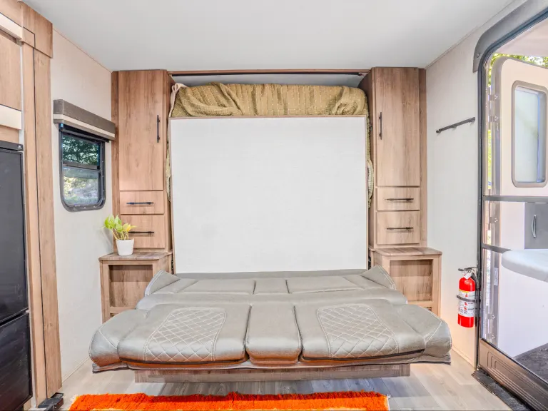 - A comfortable Queen-size Murphy bed that folds into a couch by day