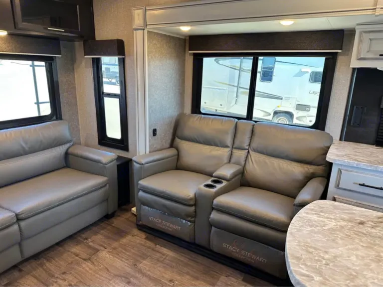 - Spacious Living – Opposing slides open up a large living room w/ theater seating, fireplace, and 50” TV