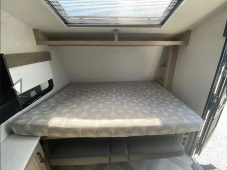 Purchased new in 2023, this Ember 190MDB maximizes sleeping space with a queen size fold-up murphy bed, two double bunks and a jack-knife sofa. It is perfect for a couple get-away or a whole family vacation. Its light weight and a breeze to tow. The "Stargazer" skylight offers the perfect view of the stars at night. The lower bunk folds up to offer extra storage space accessible through the rear access door.