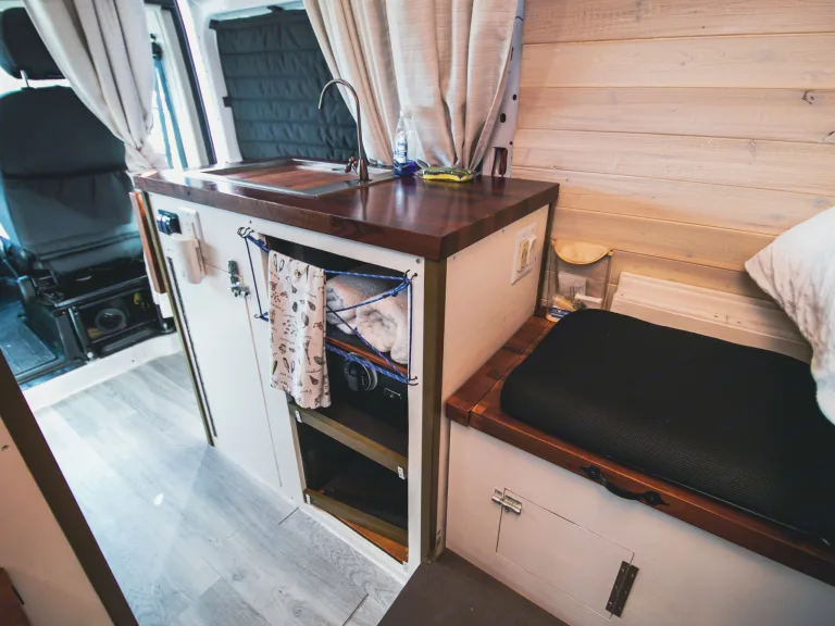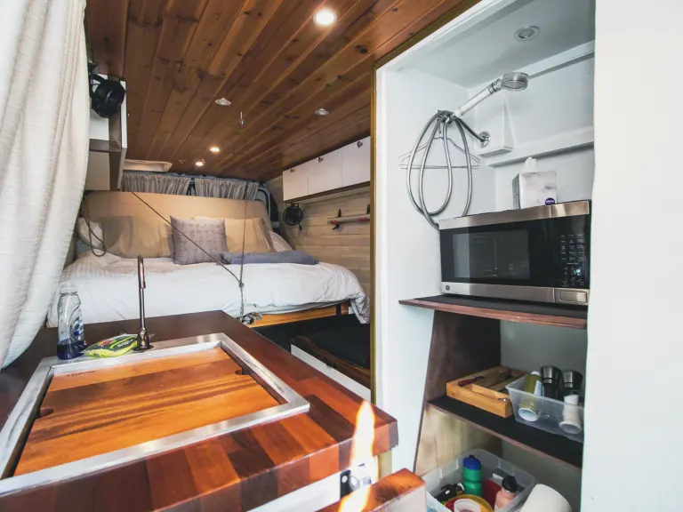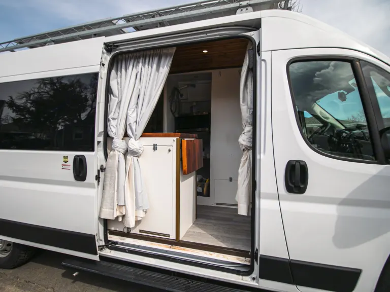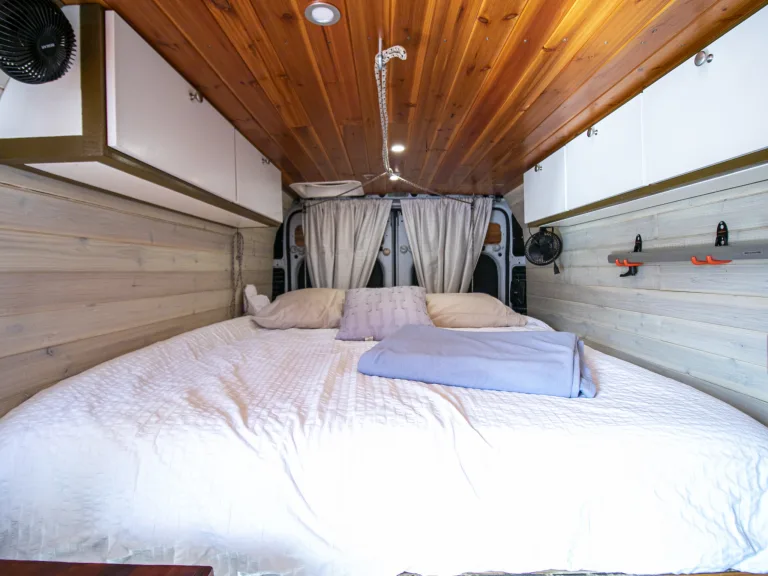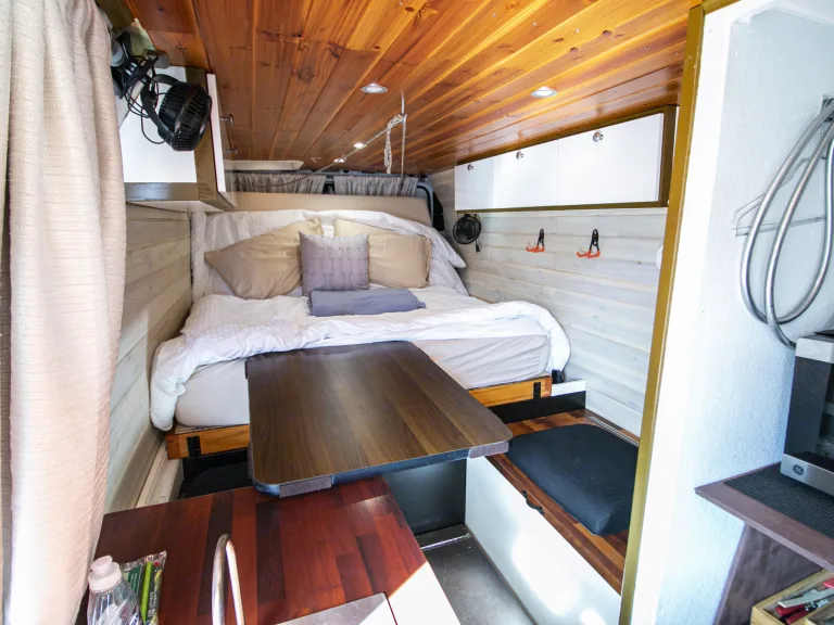 Features a home-made conversion that comes equipped for any trip - sink with a water pump (33-gallon tank of fresh water, 5-gallon tank for grey water that can easily get emptied), a kitchen space with cooking devices and equipment (fridge/freezer with 2 adjustable temperature compartments, microwave, induction stove) and a queen sized bed with plenty of storage space underneath.The van also sports several high-end components, from 800 watts of solar and an inverter capable of running a microwave or an induction cooking stove. The van (living area) is designed to run with 100% electricity (no propane, no gas generator). Only the Espar heater uses gasoline (fed directly from the van gas tank). The van is also well insulated (sprayed foam, curtains and insulated window covers) and includes one ceiling fan (other one is recently got broken and being ordered) for creating an air circulation.