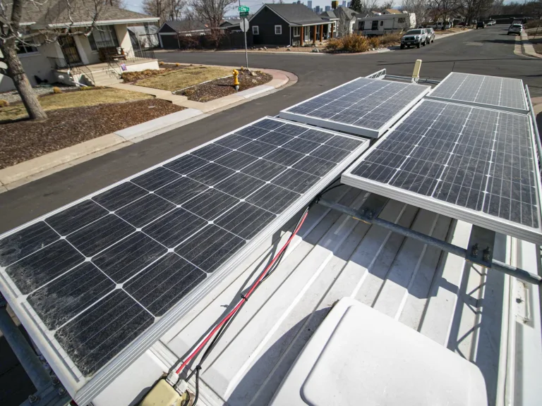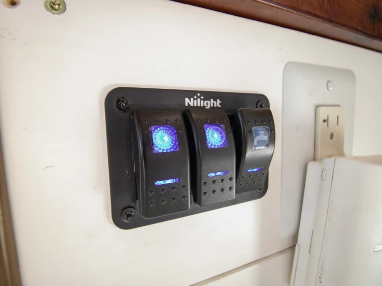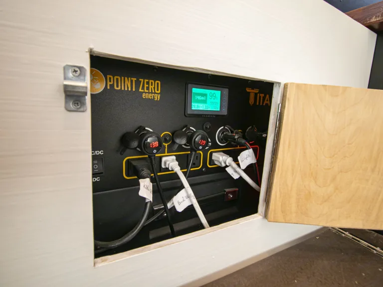 - House battery powers all appliances (lights, fans, water pump, fridge, stove, microwave, 110V-power/USB outlets)