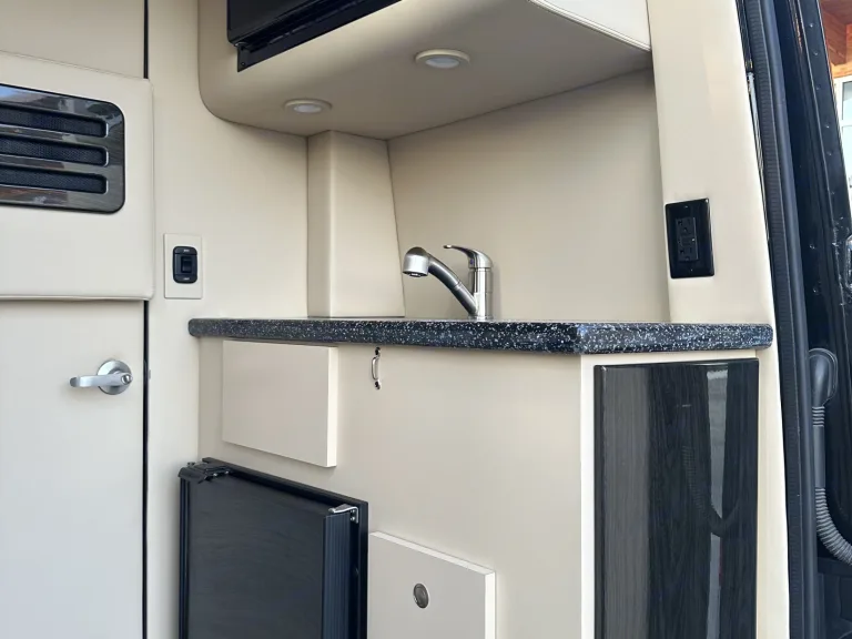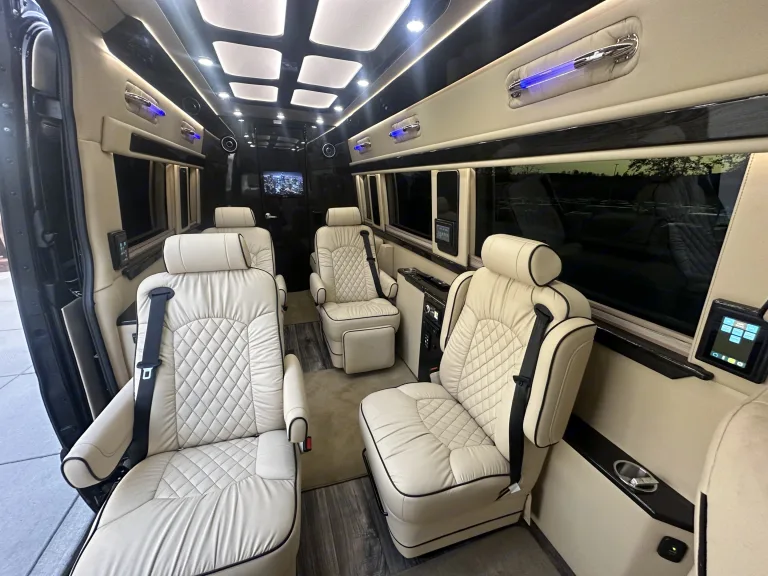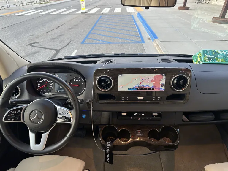 Mercedes-Benz Sprinter 3500XD AWD van featuring a custom, professional conversion fully equipped with bathroom, vanity with sink and storage drawers, refrigerator, and microwave. 6 captains chairs (2 that recline) and two smaller couches that fold into a bed. Composite wood flooring and non-slip floor mats make for easy clean up. Beautiful leather, cabinetry, tinted windows, and complete privacy shade package promote the feel of luxury. The rig is packed with two smart tv's, 110 outlets for your gaming system, USB outlets at each seat location, 2 wireless headphones, wireless internet router, exterior speakers for your vacation or tailgating party. This diesel van is a dream to drive with back up cameras, loads of safety features and all the bells and whistles. Our large family loves this van, it is perfect for the ultimate road trip.