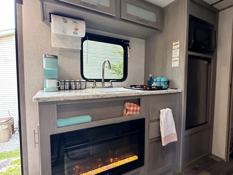 Georgia Rambler is a beautiful and comfortable travel trailer that can sleep up to 5 (4 adults comfortably)! Travel trailers are perfect for destinations where you want a home base, and be able to go out and explore the area. You tow it and set it up and it stays that way while you hop from place to place exploring.It has AC, heat with a beautiful (fake) fire place, a shower, bathroom, kitchen table, sink, fridge, microwave, stove burners, hot water heater, and an electric awning.Our number one concern is that you have a great time without all the hassle of vacationing. Georgia Rambler has a "fully stocked" option you can add on that includes everything you need. There is a t.v. for chill time and books for quiet time. If you choose the "fully stocked" option, we provide bedding and toiletries so you don't have to worry about it. The only thing you need to bring is the food, drinks, and a toothbrush!Pets are welcome also! We have two dogs and love to travel with them. When you rent Georgia Rambler, there is NO PET FEE. Pets are family too, and we believe that you shouldn't have to pay for that. Don't worry about cleaning, or dumping the stinky water, either. No ones got time for that- so we've got you!Georgia Rambler can easily be pulled with an SUV, as it weighs around 3,200 lbs. You can plug into power or choose to take it dry camping. We sanitize everything, not just the high touch areas! This RV is perfect for a fun week with. the family! We all need to unplug for a bit and just relax!Cosa è inclusoIF YOU CHOOSE THE "FULLY STOCKED" ADD ON: We have the RV stocked so all you have to do is bring food, drinks, and a toothbrush. If you are like me and love the details, look below.BEDDING: 4 pillows, sheet set, quilt.
