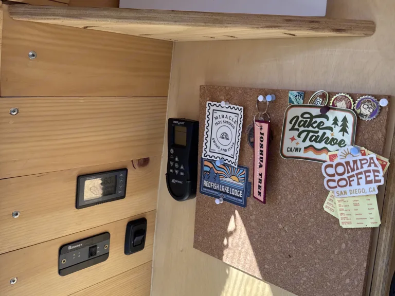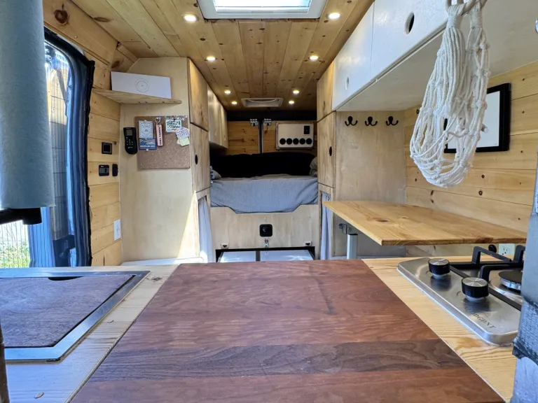 Rocky is very thoughtful. He thoughtfully designed this van. He has put weatherstripping on the back door to keep dust and light out very nice. He has a net in the front above the driver seat awesome really one of my favorite parts about the van small details like that. The wheels are brand new and you know just overall really well thought out van and a great guy. You should rent from him. He had a projector, and some games for us, and he stocked the kitchen for us with spices and utensils vehicle.
