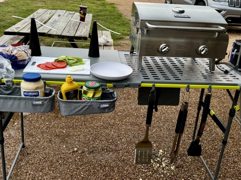 Large flip-open window brings the outside in. Tinted glass and blackout shades set the mood.•This unit includes a Blackstone propane griddle that attaches to the camper. Or, if you prefer, we offer a fantastic grill and grilling table with all the accessories you could possibly want for an additional fee. Check it out in the photos!•All-Season Comfort
