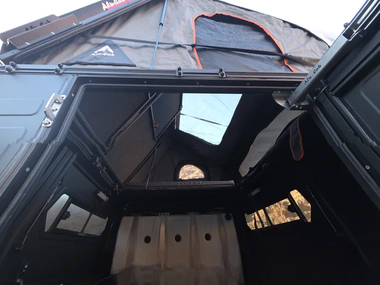 --Massive 270º driver-side awning — provide shade coverage from the driver rear door to the tailgateShower awning included — perfect for rinsing off, changing clothes, or using with a flushable portable toilet (available as an add-on)Cosa è inclusoCali King Size Sleeping Platform on the Alu Cab