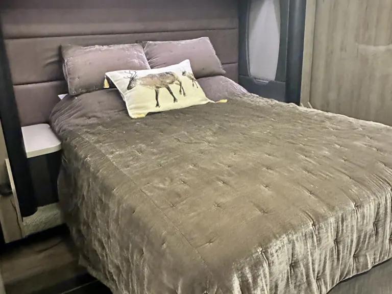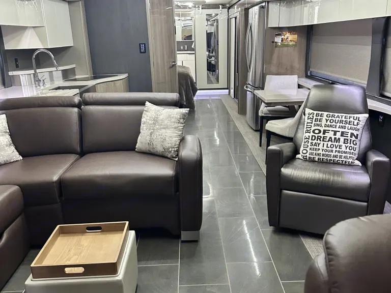 Our Motorcoach has approximate 7ft interior height, and a full wall slide that provides ample space, comfort, and style. This coach has a bath and a half with electric flush porcelain toilets and plenty of storage space in both. Also included in the Master suite is a comfortable queen size Sleep Number bed and a stacked washer and dryer. The L shape sofa converts to a full-size sleeper. The glide and dine table has 2 additional extensions and slides from side to side for roomy family dining. The kitchen is complete with stainless steel farmhouse sink, Dishwasher, Convection Microwave, and Induction cooktop stove.