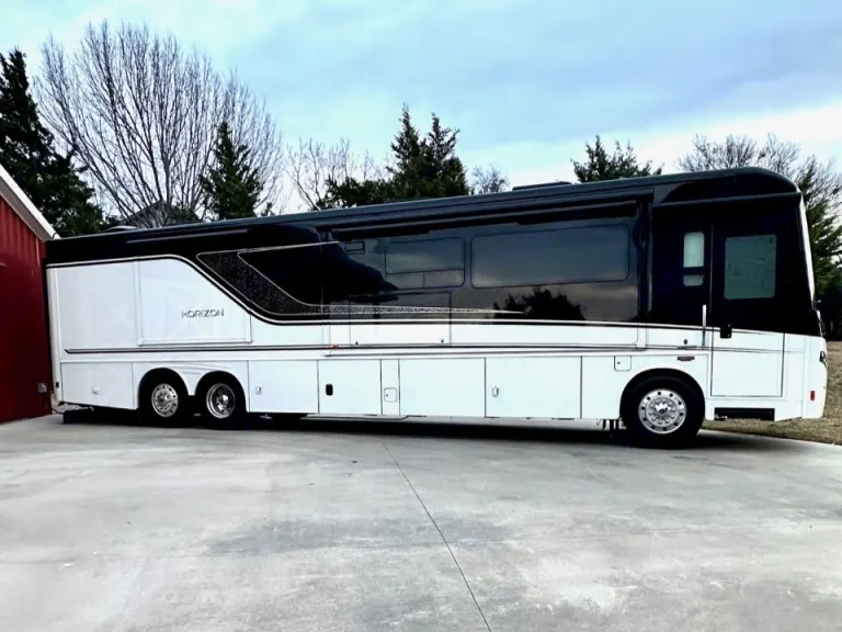 Glamping at it's finest! Our Horizon 42Q is a contemporary style coach with the cabinetry imported from Italy and Vegan upholstery, for the up most luxury in camping. This 43ft Diesel Pusher has a 450HP Cummins engine that provides the power necessary for those long trips and those mountain regions. The tag axel turns to assist the 60-degree turning radius making those tighter turns more manageable. There are video cameras on the sides to assist with safe lane changes and the rear camera assists with backing up and maneuvering into campsites.
