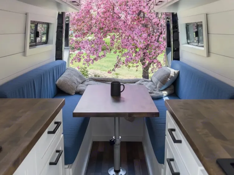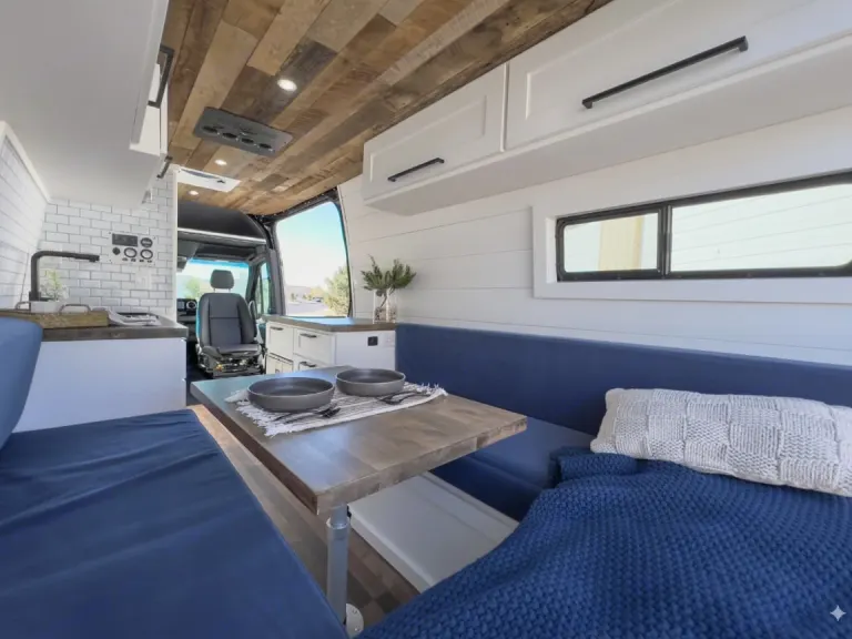• Recessed lighting 5 pucks with dimmer switchInteriorDinette with butcher block table top / memory foam seat cushions (blue)