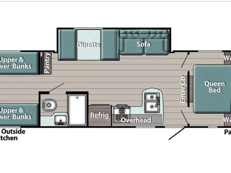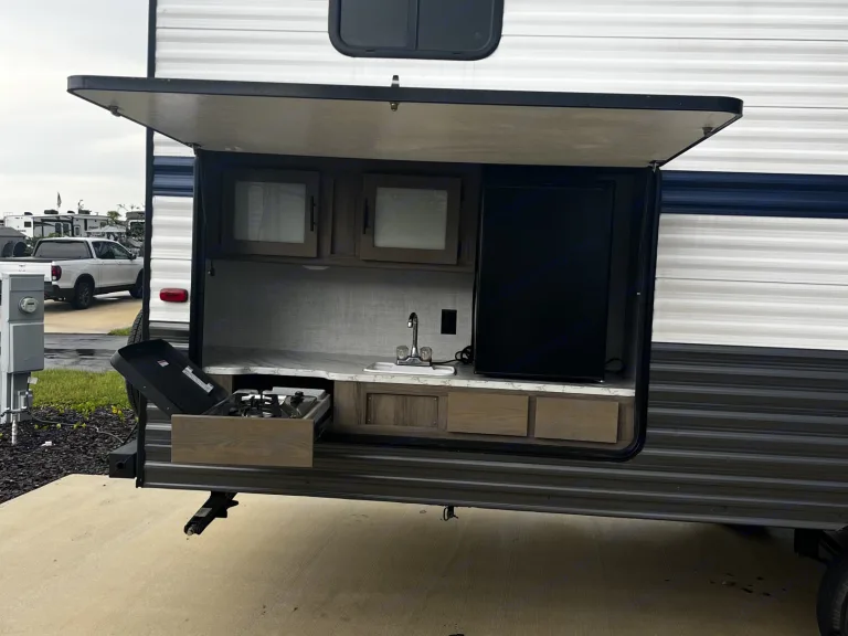It also has a beautiful outdoor kitchen with a stovetop, fridge, sink and cupboards. Has 1 slide and a roomy kitchen inside with ample counterspace.