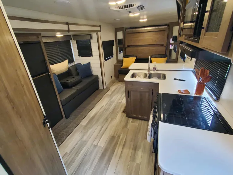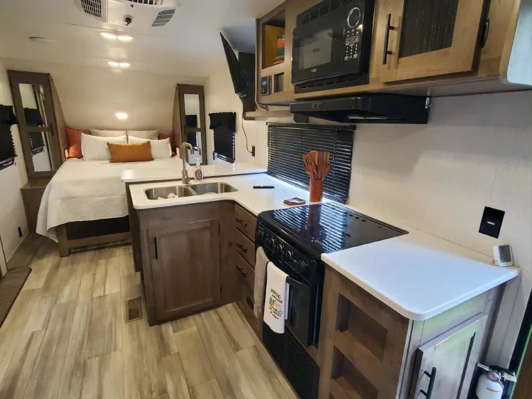 The shower is full size and has a round bar to allow more space. Bathroom is also full size! Plenty of storage. The Kitchen has a convection Stove/Oven, microwave, full size- 2 compartment sink and comes with everything you need to cook except the food! Theres even an outdoor kitchen with a griddle and mini fridge that is great for making the bacon, or your breakfast of choice. It has 2 propane tanks for longer reservations. 30 Amp hookup or rent our 30 amp gas powered generator to go off the grid. We also have Starlink available for internet anywhere!
