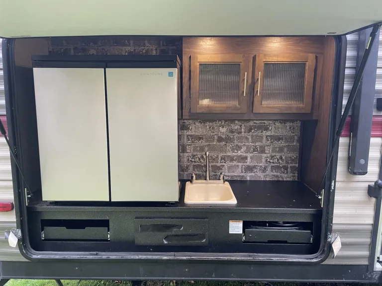 Our favorite part of our camper is the outdoor kitchen. Use this space to prep your coffee and breakfast , while watching the sunrise. Or stock the outdoor refrigerator with your favorite drinks and enjoy an evening campfire.