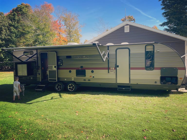 We believe the beauty and tranquility of the U.P. is an unforgettable experience, that everyone should enjoy, and we hope to provide you with your home away from home.Cosa è inclusoMater: Queen bed with storage closets. Linens are included.Bunks: One full bunk next to an additional twin bed located above storage compartment. Linens are included.Conversions: The dining room table and couch also convert to beds for additional sleeping. Linens are not provided for the conversions. Guests are responsible for this.Indoor Kitchen: Comes with pots & pans, coffee pot, toaster, dishes (plates and bowls), cups, utensils, knives, kitchen sponge and dish soap/hand soap, broom/ dustpan and garbage bags. It also comes with a microwave and oven/stovetop.Bathroom: The bathroom has a toilet, sink and shower. Toilet paper is included.Outdoor Kitchen: Refrigerator/freezer, sink, 2 burner propane cooktop.Entertainment: TV, radio with CD and Bluetooth. Radio will play indoors and/or outdoors.Outdoor shower: There is an outdoor shower with a shower wand in the front of the camper.The camper has a key pad lock for the main door. Guests will be given a code upon arrival.This camper is only available for delivery. No self-tows or pick-ups.Delivery: Delivery, setup and clean-up is a flat rate of $200 within 100 miles of Manistique, MI and 4$ per mile for any additional miles.A refundable damage deposit of $500 is required.During peak season (Memorial day to Labor day) we have a 4 night minimum. After Labor day and before Memorial Day we have a two-night minimum stay.Check out our many add-ons to make your stay more enjoyable!!RaccomandazioniThe UP of Michigan has many wonderful points of interest whether it's a day trip away with your family or at one of Michigan's exclusive campgrounds. The area has several beautiful waterfalls along with stunning hiking trails along Pictured Rocks National Lakeshore.Some of the other popular day trip destinations include Garden Peninsula's historic ghost town, Fayette, Manistique's big spring aka Kitch-iti-kipi, Sault Ste. Marie's Soo locks and Newberry's Tahquamenon Falls.Altre cose di cui prendere notaDELIVERY ONLY NO SELF TOWWe are registered with the State of Michigan as a licensed vendor and are able to deliver to state parks.