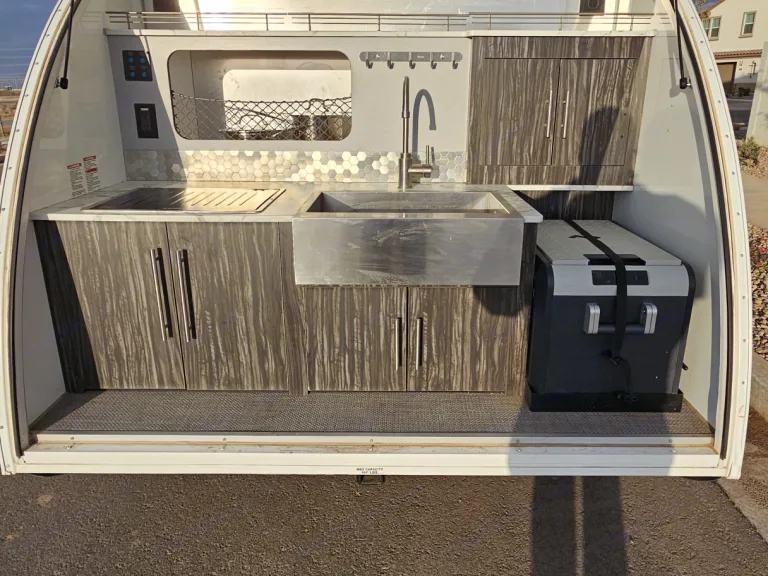 Experience the charm and simplicity of a classic teardrop trailer, thoughtfully designed to provide a cozy and comfortable getaway for two. This compact yet feature-packed trailer ensures a memorable adventure while keeping things convenient and hassle-free.Inside, you’ll find a comfortable sleeping space perfect for relaxing after a day of exploring. Enjoy year-round comfort with an efficient AC and heating system, ensuring you stay cool in the summer and warm in the winter. For entertainment, the trailer is equipped with a TV, radio, and Bluetooth connectivity, paired with built-in speakers to set the perfect mood, whether you’re winding down with a movie or enjoying your favorite tunes.The kitchen is compact but fully functional, featuring an electric cooler to keep your food and drinks fresh and ready. The scenic front window not only enhances the natural light inside but also allows you to take in the stunning views from the comfort of your trailer. LED lights throughout the interior add a modern touch while providing excellent illumination for all your activities.Whether you’re heading out for a weekend getaway or a longer adventure, this teardrop trailer offers everything you need to make your journey comfortable, enjoyable, and unforgettable!Cosa è incluso•cooking pans