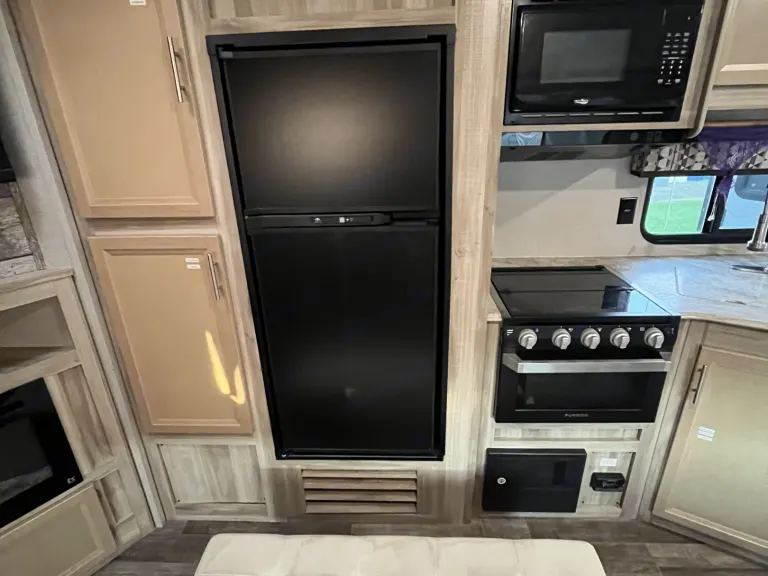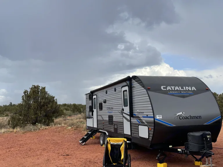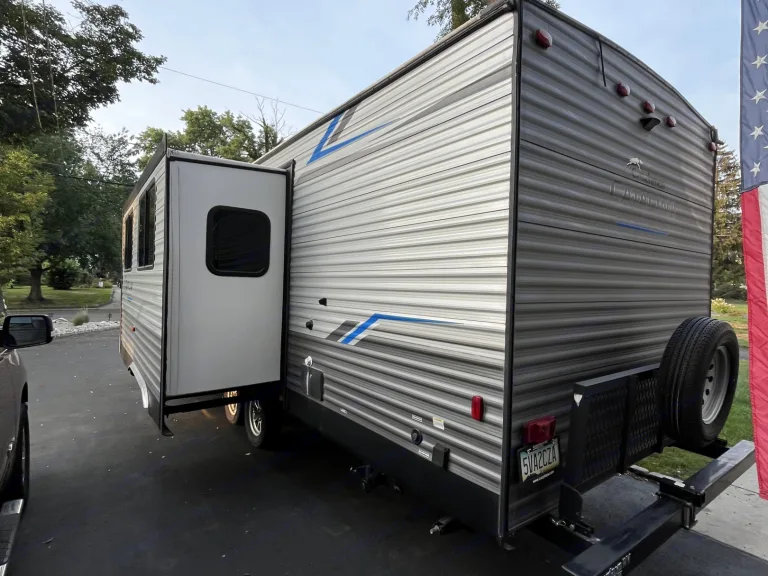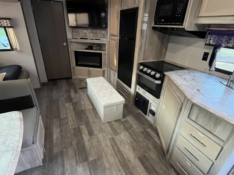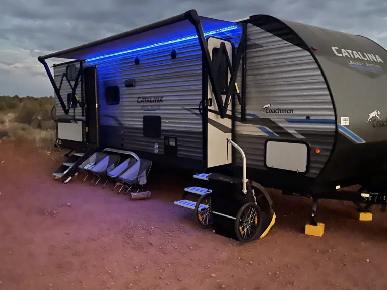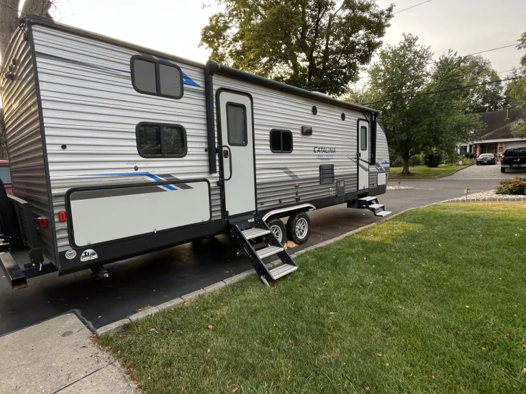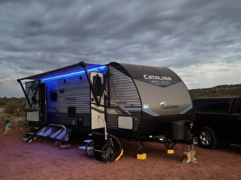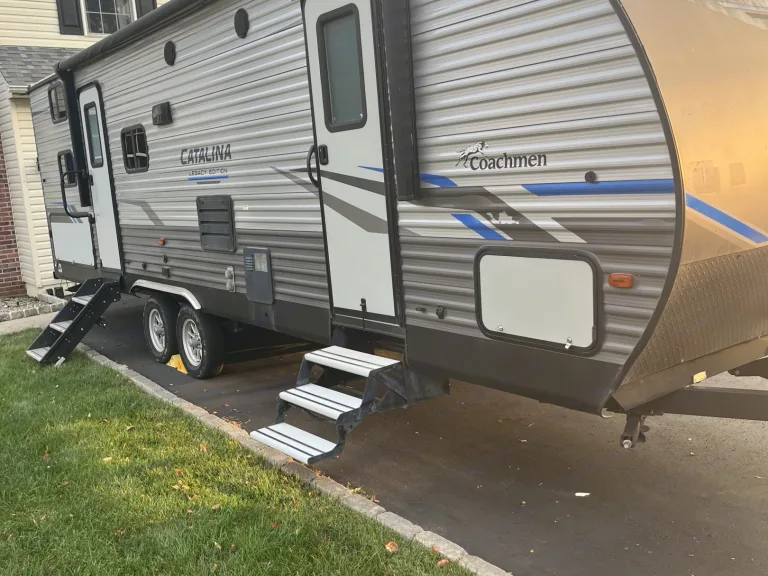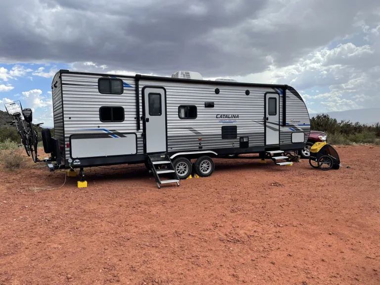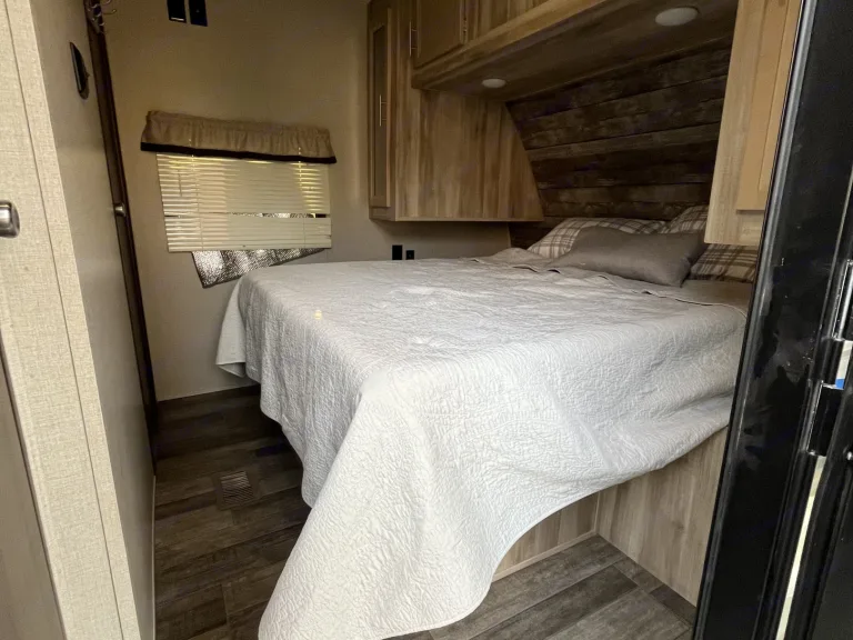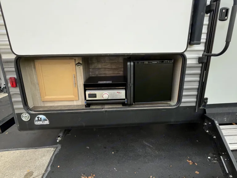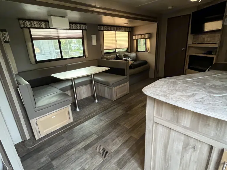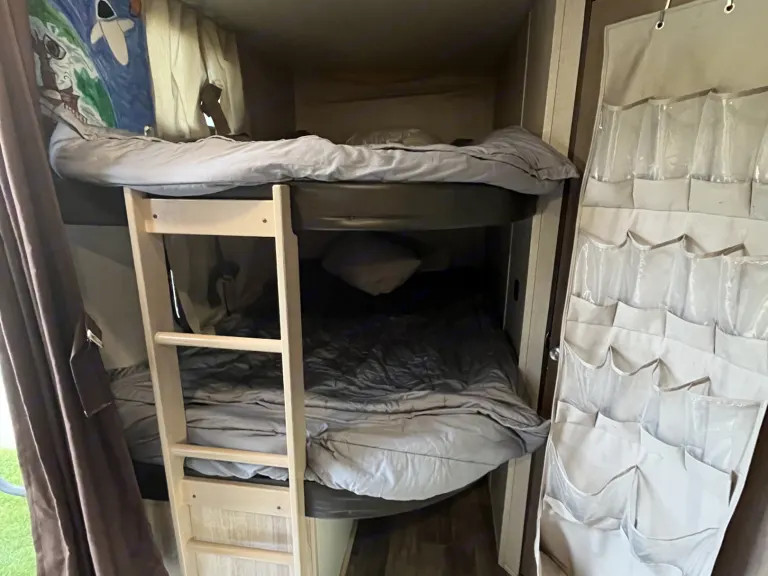 Fully stocked, this Catalina has everything you need for a comfortable trip. Bunk beds for the kids, a cozy space for your furry friend, and a comfortable queen bed behind a door for the adults. We've included cooking essentials and linens to make camp life easy! Additionally, food tastes better when it's cooked outdoors. Our camper has convenient outdoor-kitchen features which not only helps everyone enjoy their time at the campsite, they help keep the indoor kitchen clean. Our camper also has outdoor adjustable lighting under the awning that is perfect for setting the mood. So unpack, relax, and take in the great outdoors.