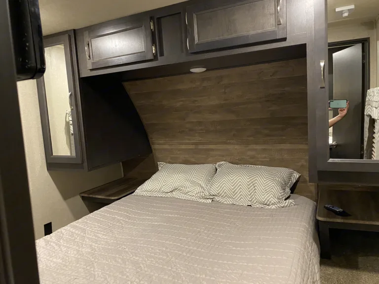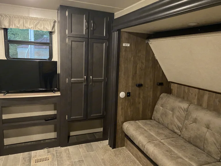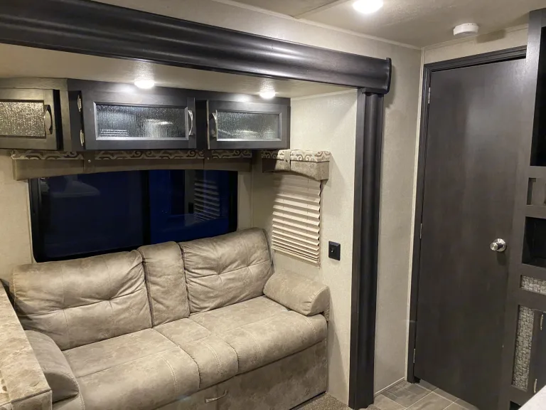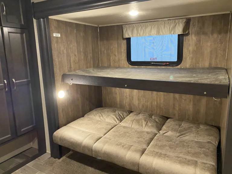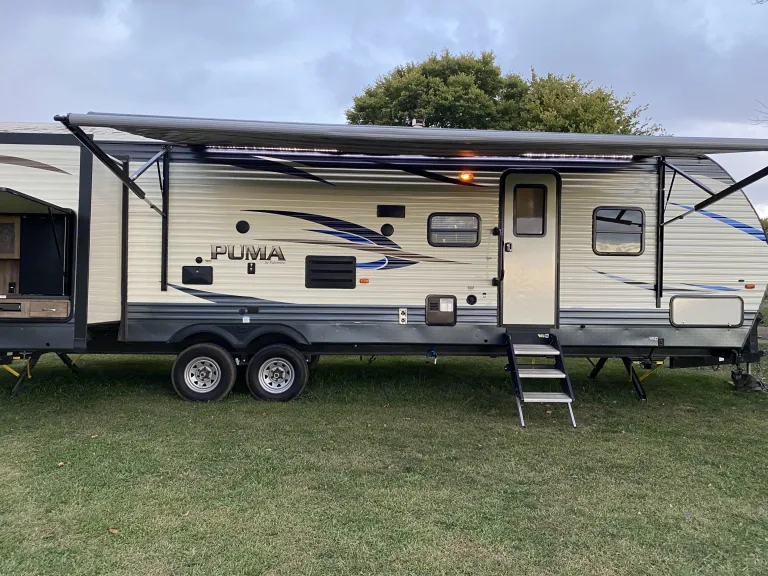 Are you ready to hit the open road and explore the great outdoors? Our luxurious 2018 Palomino Puma is the perfect vehicle to take you on your next adventure. With its sleek and modern design, you'll turn heads wherever you go.Step inside and be blown away by the spacious and comfortable living area. The RV is stocked with plush seating, a flat-screen TV and a dining table perfect for dining or playing games with family and friends. The kitchen is fully equipped with all the conveniences of home, including a refrigerator, microwave, stove, and oven.After a long day of exploring, retreat to the master bedroom where a comfortable queen-size bed awaits you. The unit also features a comfortable sleeper sofa, conversion dinette, and three bunks providing plenty of sleeping space for up to eight people.Additional amenities include air conditioning, a full bathroom, and plenty of storage space to ensure a comfortable and stress-free trip. So pack your bags, grab your family and friends, and get ready for the vacation of a lifetime!Renting with us is not only a good choice, it’s a smart one too! We have a full staff dedicated to making sure your get away is flawless – from detailed inspections before rental and managing campers on site, to RV techs on standby for any questions or concerns. We love what we do and we intend to provide the best experience for all! Come see for yourself!