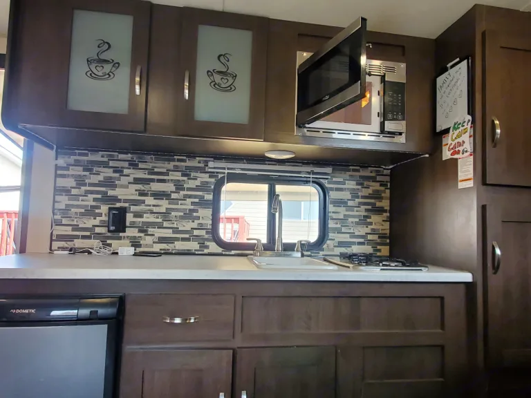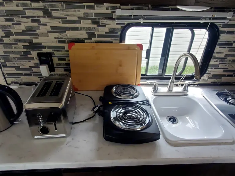 Shower, toilet. 2 burner stove, 900W microwave and fridge, flat tv, Bluetooth AM/FM radio player with outside speakers, tanks and battery monitor, Hot water heater, Gas furnace/heater, Air Conditioner (13.500BTU), LED exterior light strip, Power awning.