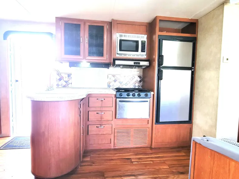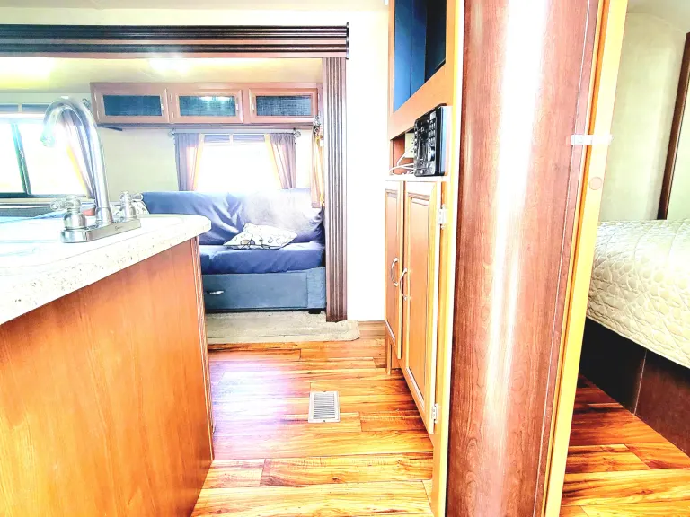 This travel trailer is your home away from home with 2 separate bedrooms. A full kitchen for making your favorite meals. If not then just store your left overs from your favorite restaurant to reheat later. Master bedroom with queen bed and tv and separate rooms with 3 beds and seating area with tv. Main room has wrap around dinette, a sofa and kitchen with entertainment center. If you prefer cooking outside there is a outside kitchen to BBQ, prep sink and small fridge.Cosa è incluso2x camp chairs, camping table, linens, cookware, utensils.