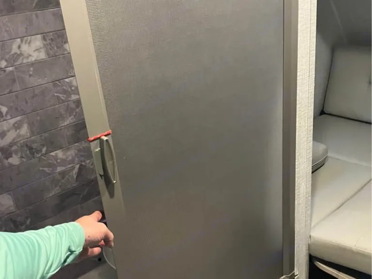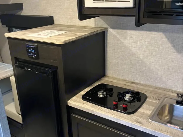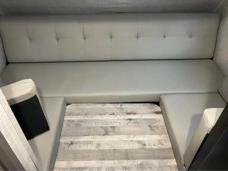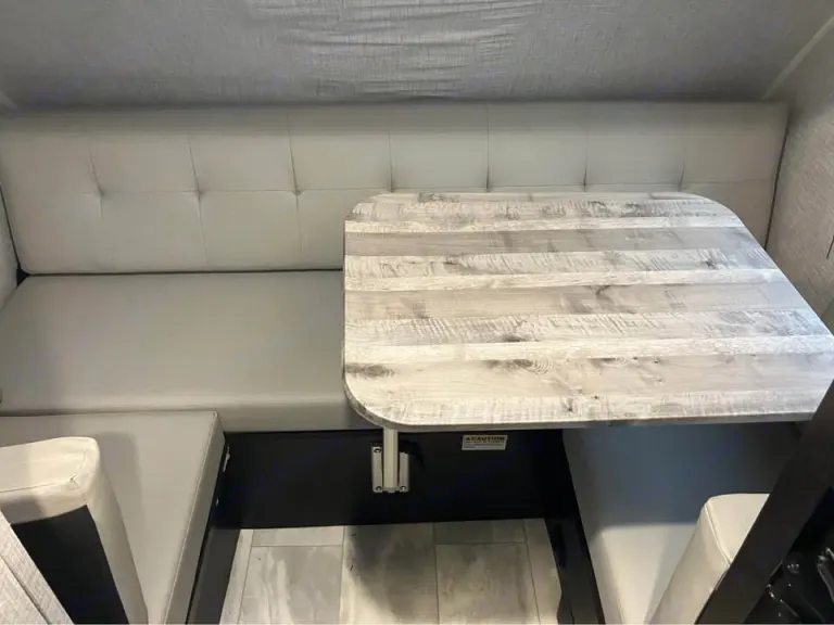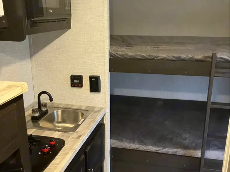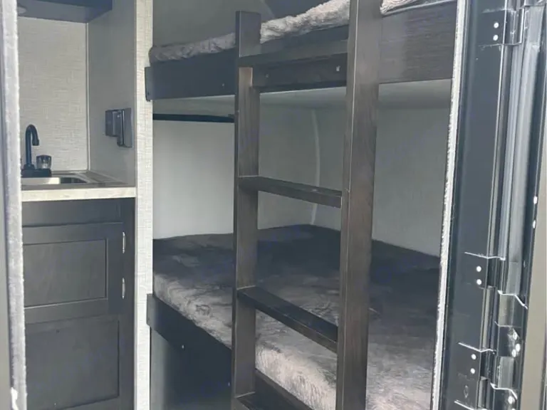 The camper’s clever design features a convertible space that transforms from a queen-sized bed into a dining area. Plus, you’ll find full-sized, comfortable bunk beds—perfect for adults or kids alike.