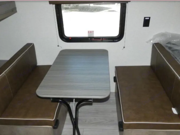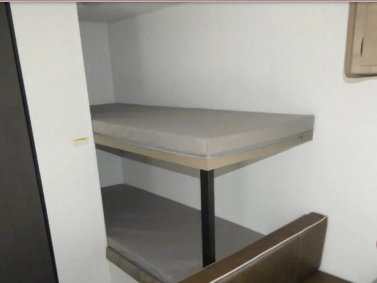 This trailer sleeps up to 5 adults comfortably with cozy bunk beds, a convertible dinette, and a comfy bed. It’s fully equipped with:
