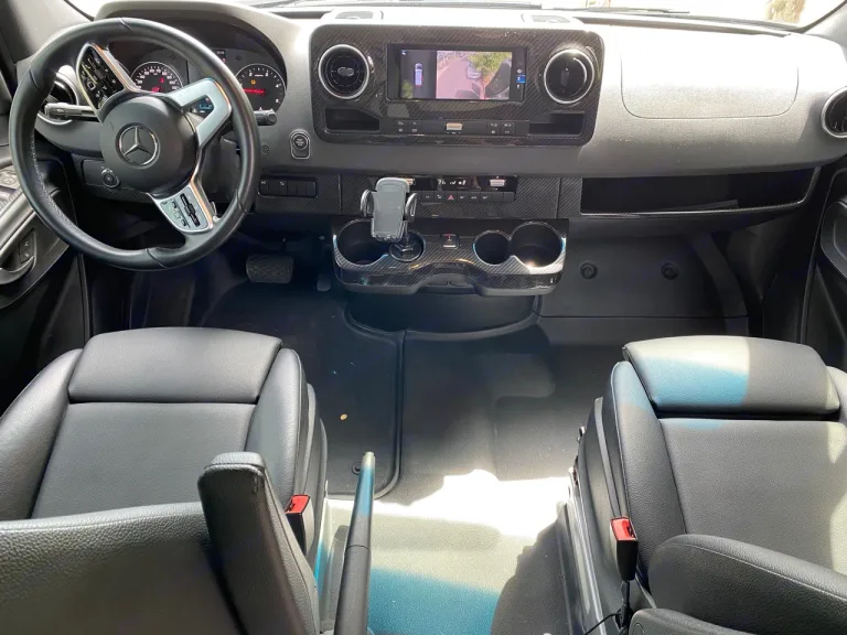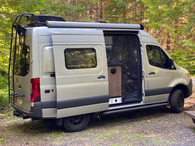 This is a top of the line, fully loaded Sprinter 4X4 RV, professionally outfitted by Winnebago. This van has all the bells and whistles - latest technology electronics and features, GPS, solar, indoor/outdoor showers, toilet, sink, induction cooktop, two-stage lighting throughout, many power ports, power awning and power slider door. It also has a Maxxfan, air conditioning (when connected to shore power), magnetic insect screens and blackout shades for comfort and a good night's sleep.The cargo area is huge, for all your gear, and there are cabinets for essentials and travel gear. There is a full size bed, and in theory a small single foldout bed, but we only permit travel for two persons, as the seatbelt and sleeping arrangements for a third are inadequate.The vehicle is meticulously cared for, everything works perfectly, and the van is clean and odor-free. All of the typical camping gear is included int he price of the rental - bedding, cookware, outdoor stove, chairs, table, and miscellaneous supplies.