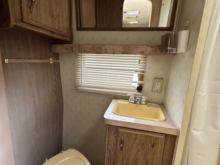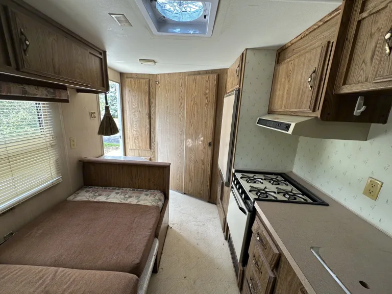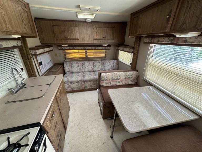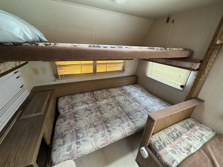 This 1986 Fleetwood Wilderness camper trailer is comfortable and tried and true for the playa. It includes everything you see in the photos. The main bed is a double bed that folds back into a sofa. It can sleep a couple, or one solo adult. The dinette converts into another bed that is full sized for one adult (I am 6'1' male and I sleep comfortably on it). The bunk bed is good for a child or a small adult (I'd guess under 120 pounds). So max capacity is 4 adults, but only 2 large males could sleep comfortably in it. The AC unit is a standing unit that vents out the floor, but requires you to plug into a camp's generator ("shore power") as our generator is only useful for short durations.Cosa è incluso•We will stock everything you need in terms of cooking tools and utensils, cleaning products, towels, and paper items. We will provide shampoo, conditioner, and soap as well. Most importantly, no need to clean out the playa dust before returning! We will take care of the deep cleaning, just make sure you throw away your trash and take your personal items.Altre cose di cui prendere notaNo smoking inside the RV please.