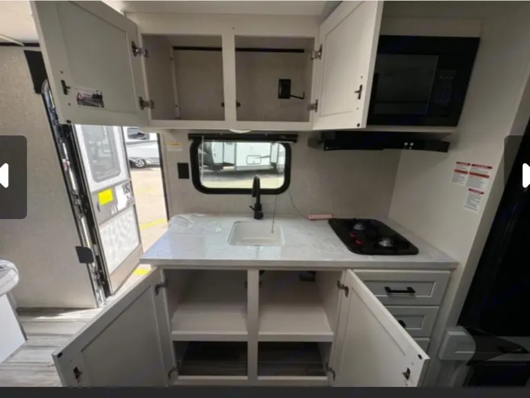 Spacious & Modern Interior: The open layout maximizes space, with a fully equipped kitchen (stove, microwave, fridge) and a dinette for meals or game nights.