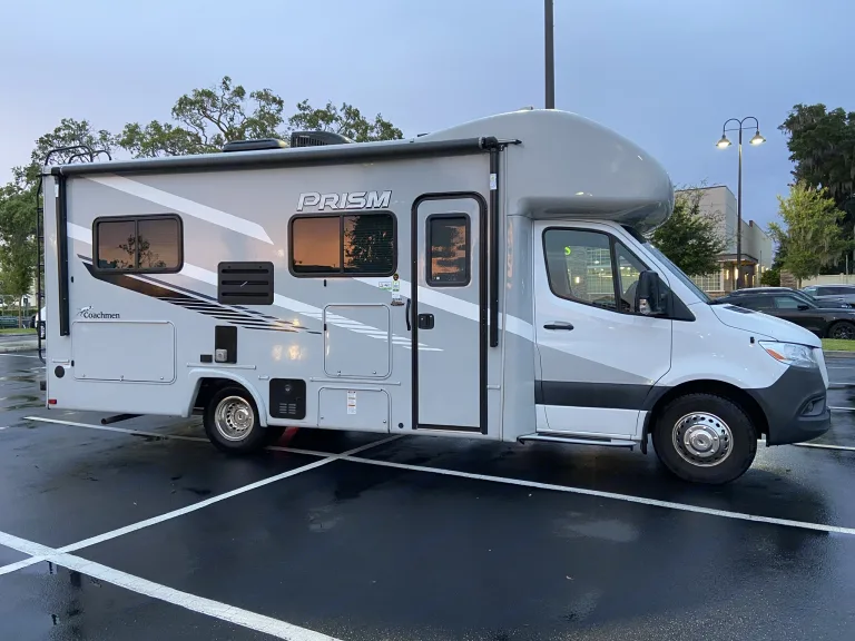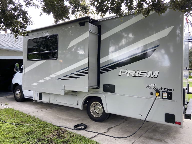 Great new Coachmen Prism Class C diesel motorhome 24CB You will be surprised by how easy it is to drive this 2021 Mercedes-Benz turbo 3.5 diesel 26 “ Motorhome it's the best driving experience and the best fuel economy in its class with an average of 16 to 18 miles per gallon you'll save a lot of money on fuel cost.The interior is fully equipped for you to enjoy many trips away from home with the three-burner range, refrigerator, and countertop extension in the kitchen, large slide out and the full-size bed, U-shaped dinette, and 54" x 80" bunk above the cab will also provide you with sleeping space while you're gone 32 Roku Smart tv. You can keep your belongings stored away in the large closet, and the full bathroom has its sink located just outside the bathroom door so that someone can wash their hands while another camper is taking a shower in the inside or the outside shower with the Truma Aqua Go On Demand water heater. The Coachmen Prism Class C diesel motorhome is stylish, reliable, and prestigious! Because of the Mercedes-Benz driving features, you can travel confidently with the automatic 7G-Tronic transmission, active lane-keeping assist, active brake assist, attention assist, adaptive cruise control, Mbux multimedia system with navigation and the intelligent voice control system.Cosa è inclusoRoku,Netflix, Disney plus,Pluto tv etc,SiriusXM satellite radio, Apple play,android, Voice command navigation,three-way camera, on demand tankless water heater, 3 gas burner, gas stove, microwave, wireless phone charger, USB + USB C fast charger station, leather swivel powered captains chairs, Active lane assist ,upgraded queen mattress,Coleman Grill with tank,2x outdoor rocking chairs,2x outdoor chairs,1x camping mat, 1x 4ft camping table, 14 foot awning with LED lights, sheets blankets, 4x pillows 2x rechargeable LED flashlight. Keurig Coffee Maker- Bring your favorite K-Cups