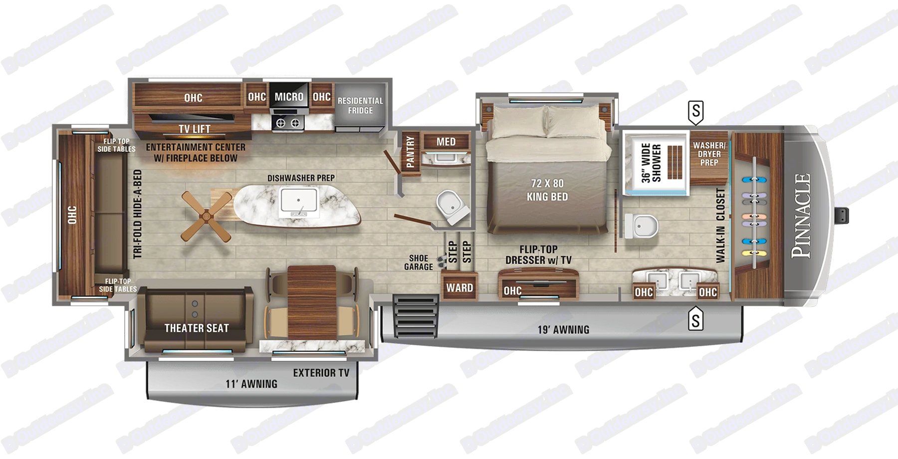You will also enjoy the interior of the Pinnacle for its luxurious details, like --•the stainless steel 21 cubic foot refrigerator with water/ice in the door •and the powered reclining theater seats with heat and massage