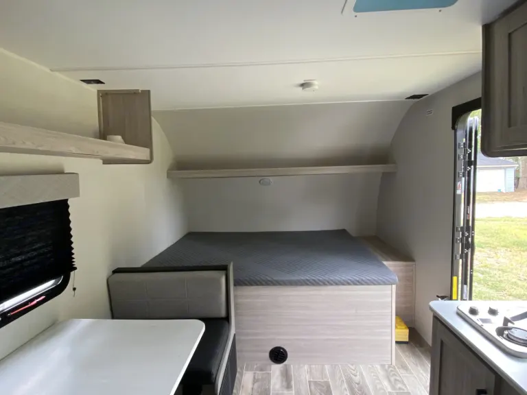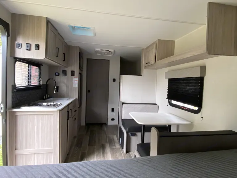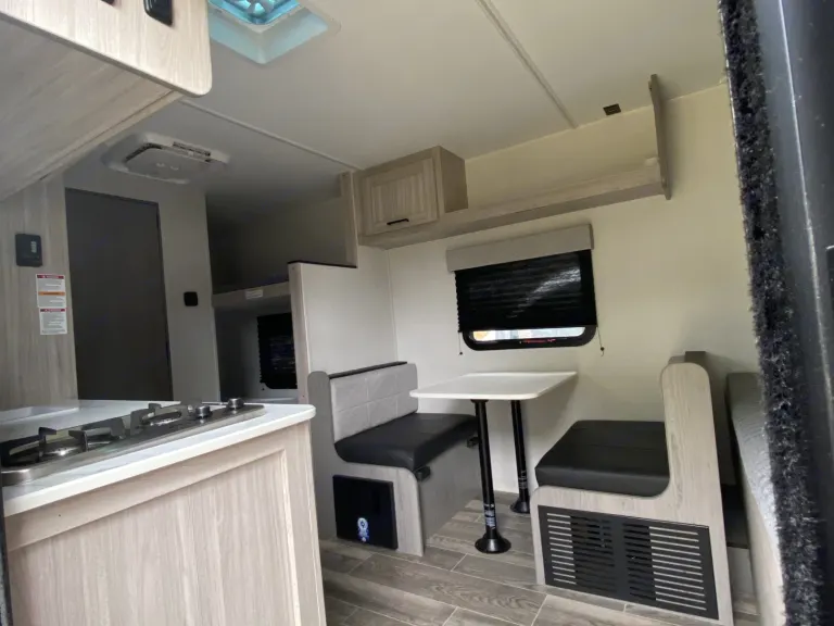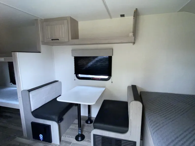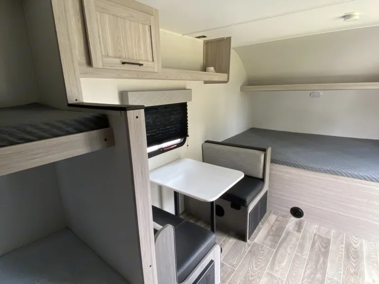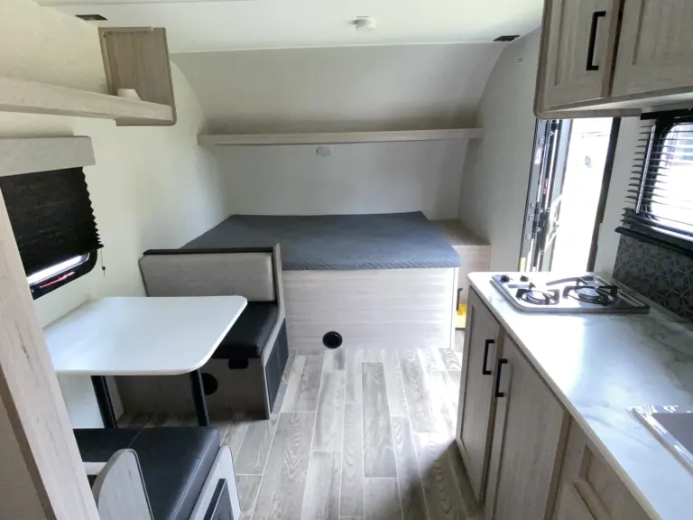 Inside, the Mallard 17BHL it feels spacious and cozy. The queen bed up front provides a comfortable place to unwind after a day of hiking, while the bunk beds are a hit with the kids but can comfortably sleep an adult as well. The dinette changes into an extra sleeping space, perfect for guests or lounging during a rainy afternoon.