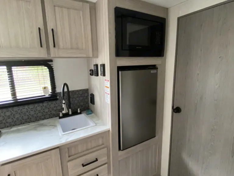 The kitchenette come equipped with a two-burner stove, microwave, refrigerator, and plenty of counter space — ideal for quick breakfasts or campfire-side dinners. The full bathroom with a shower and flush toilet makes the experience feel more like glamping than roughing it.