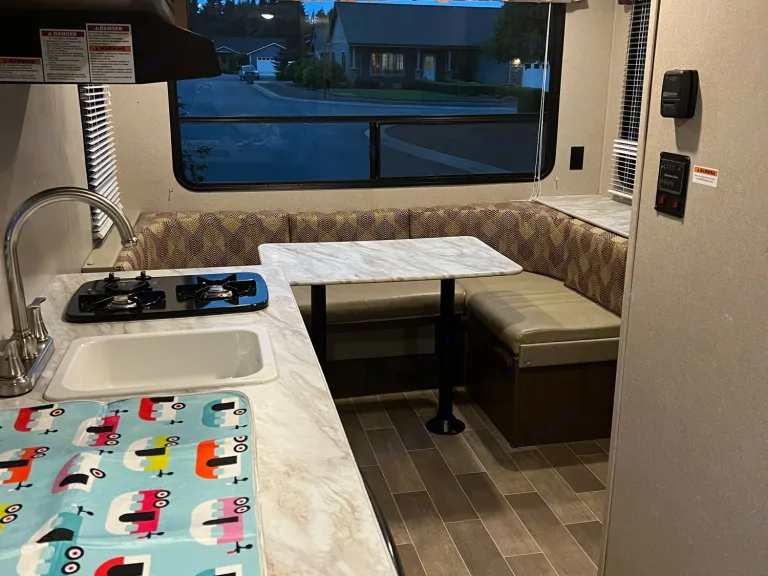 A beautiful, comfortable, and light camp trailer that is perfect for your small family needs. The queen bed was updated to a memory foam mattress. The dinette conversion table can sleep the kiddos. TV, AC and heat ensure comfort inside if the weather goes south. Power awning and outside Bluetooth speakers for updated fun. Incredible large windows surrounding the dinette that add natural light and scenery. Update March 2025: Please note, we no longer allow pick up of the trailer. We will take sole responsibility of delivery to local spots only in the Sequim and Port Angeles areas. Due to damage caused by a renter that RVShare did not cover, the interior walls have scratches down the sides with dings on the exterior. Because of this event, we will require a larger deposit. This will happily be returned upon pick-up. For delivery on weekdays, please note that delivery time will be no earlier than 5:30pm. For pick-up on weekdays, please note that pick-up time will be no later than 7:30am or after 5:30pm (no extra charge for a later week-day pick-up). Cosa è inclusoFor your comfort, we have included a coffee maker, toaster, outdoor camping mat, dishes, cooking utensils, silverware, knives, cutting boards, mixing bowls, electric skillet, water filtration pitcher, can opener, dish soap, hand soap, cleaning supplies, 4 stainless steel coffee mugs, 3 adult camp chairs, 1 youth camp chair, games (cribbage, cards and Yahtzee), s’mores sticks, and 1 bundle of wood.RaccomandazioniSequim Bay State Park and Dungeness Recreation Area.Altre cose di cui prendere notaWater and propane will be full on delivery. Absolutely no smoking including e-cigarettes and pets.