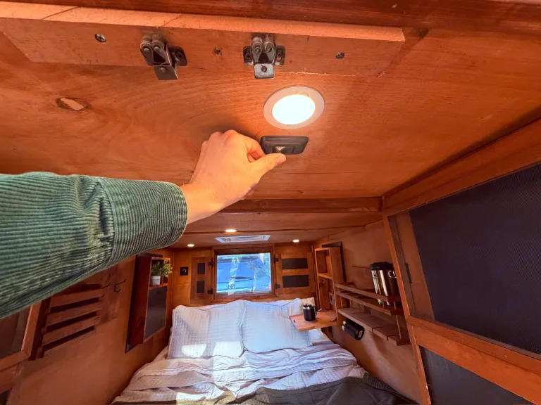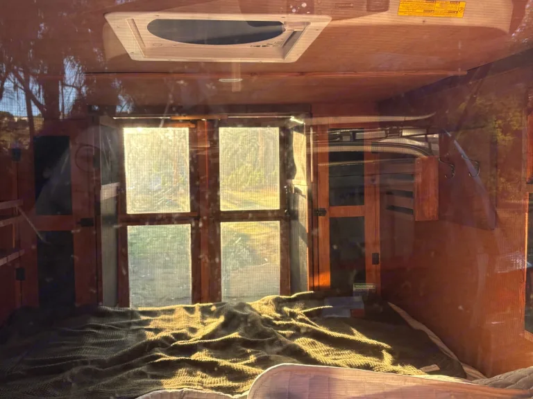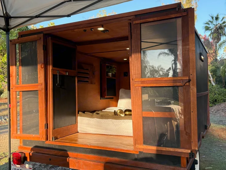 Meet Sol + Cedar-A Custom-built and CA DMV registered; well-maintained and simple to tow—happy to walk renters through setup.— Thoughtfully handcrafted micro camper built for couples looking for a romantic getaway or a sole adventurer craving a minimalist escape. The warm cedar interior creates a tiny-cabin retreat on wheels, while solar power and intentional storage keep your stay comfortable without the bulk of a large RV.Inside, a queen bed offers cozy bedding with glamping-style comfort, framed by large windows, and natural wood tones that are perfect for slow mornings and quiet evenings.