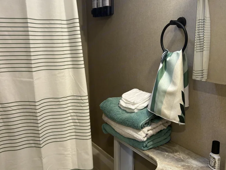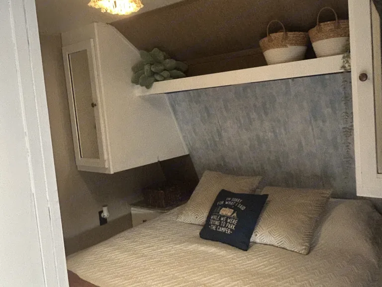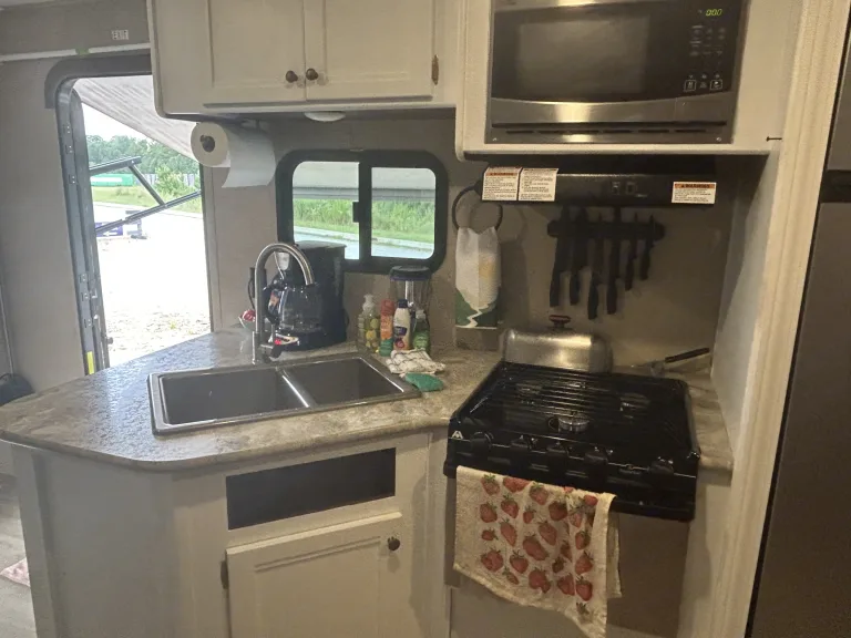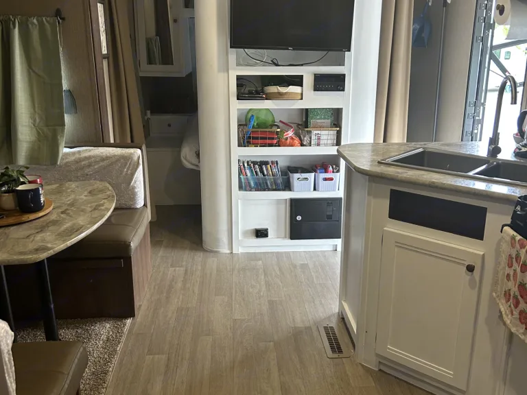 Welcome to our happy place! Our white, freshly painted, inviting, BIG interior, has plenty of space for adventure. The Master bedroom (queen size bed) is separated by entertainment system - with old school Nintendo and some DVDs! Large U-shaped dinette, lots of counter space. Double bunk beds (our kids love them!) Bathroom has shower/tub, toilet, and sink. But our absolute favorite part is the outdoor kitchen - complete with a fridge and sink, we love sitting outside for our morning cup of coffee, and going inside as little as possible after that! We hope you enjoy our camper just as much as we have enjoyed making memories in it.Lots of storage space -