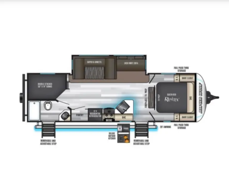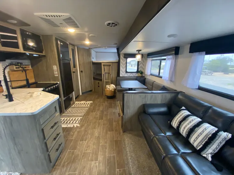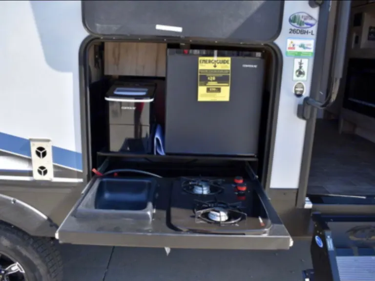Our trailer has all the new specs that lightens your load for your next trip. There is a front private queen bedroom and two full size bunks in the back. A outdoor kitchen is included with a fridge, two burners and an ice maker. A 40 inch tv inside and a fireplace makes the space nice and cozy on those cold nights. Yes we are pet friendly! We love bringing our furry friends on adventures so we want others to enjoy as well! We also provide pots, pans, cooking utensils, a keurig coffee maker with coffee pods, creamer and half and half, or we have a french press and a tea kettle if thats more your speed. We provide cleaning supplies during your stay, a broom and mini vacuum are in the pantry to help pick up that dirt or sand during your stay. We do not provide sheets or linens for the beds, so please be prepared to back sheets and blankets for you and your family. I'm happy to send a packing recommendation list too. Feel free to reach out with any questions or concerns.Extras: