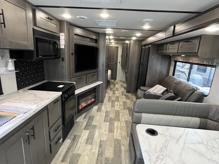 Say hello to Caroline. She is in brand new condition and ready for any adventure you have in mind. Great for tailgating, full hookup parks or a place for family in your driveway. The best features are two bathrooms and a fireplace that heats and lights the whole RV. The awning is electric and opens up electrically over an exterior TV creating an outdoor living area. I also has a washer and dryer for added convenience. RV is fully ready with all bedding, towels and kitchen items. Comfortably fits 4 adults or 2 adults and 4 children.