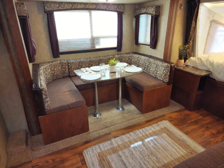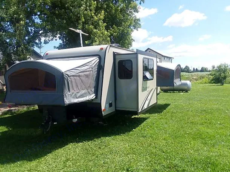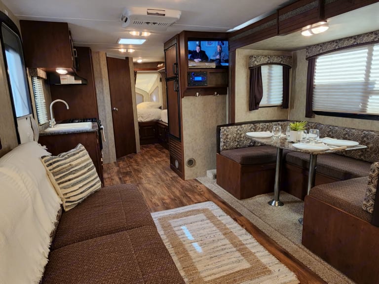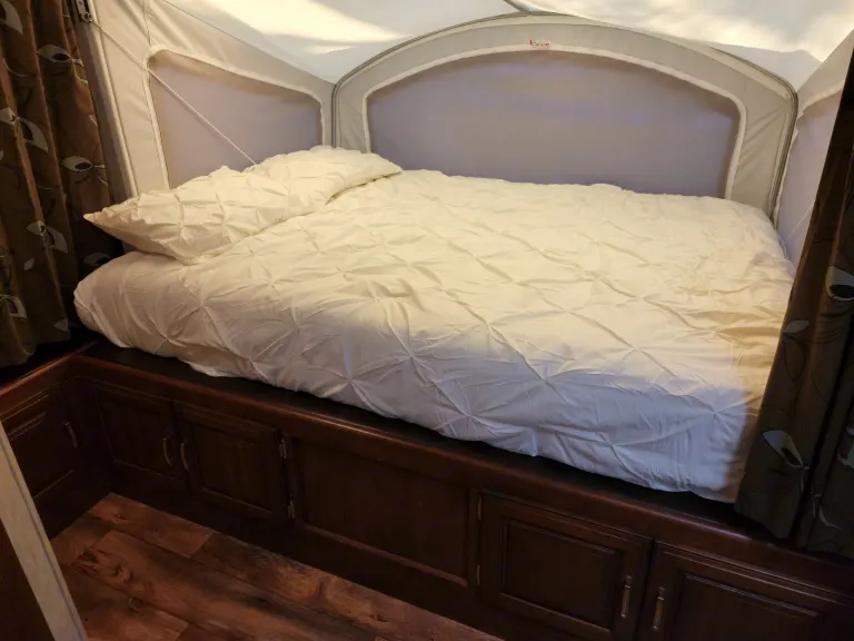 Welcome to our fully stocked and spacious camper. It has three queen beds that have brand new comfortable thick memory foam mattresses. The camper also has one slide out with a wrap around dinette that seats the whole family. There is also a fold down couch and an entertainment center with a TV (Over the Air Antenna) , DVD Player, Radio and lots of speakers both inside and out. The camper is equipped with a full bathroom (shower). There is a an outdoor shower / garden hose. The camper also comes with an optional generator to provide power when not connected to an electric hook-up. There is also an retractable awning.