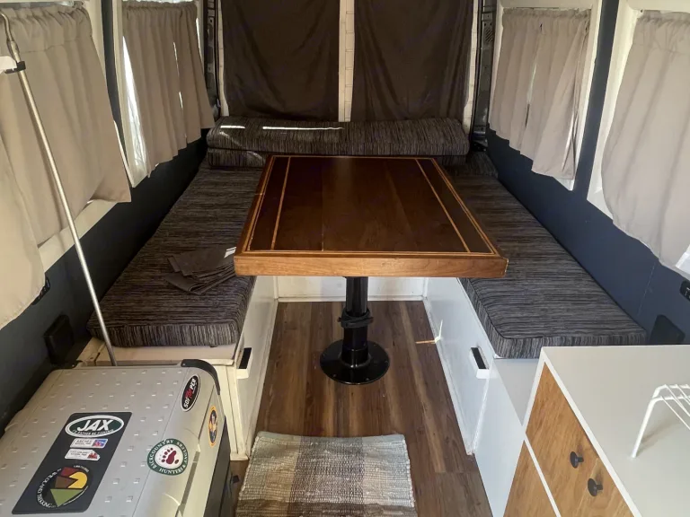 Rear table comes down for a large bed (3 kids or 2 adults can sleep here).