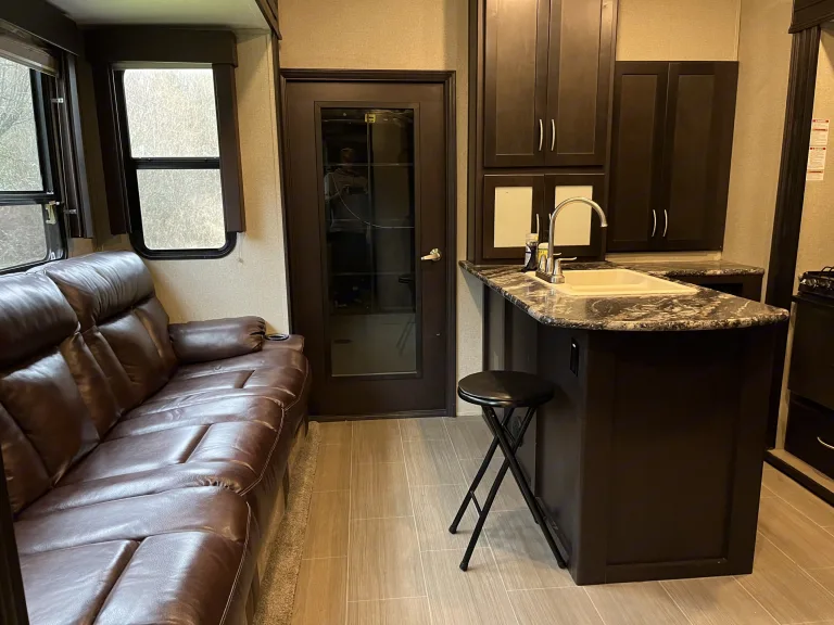 The 2018 Keystone 35 Toy Hauler boasts a spacious living area with high ceilings, creating an airy and open atmosphere. The floor plan is designed to provide both functionality and comfort, with a cozy living room area that includes a comfortable sofa and a large flat-screen TV. The open concept allows for easy flow between the kitchen, living room, and the garage area, ensuring a smooth transition between relaxation and adventure.Fully Equipped & Stocked Kitchen: