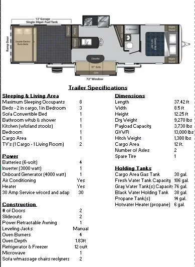 One of the standout features of the Keystone 35 is its garage area, which offers 12ft of space (82" in height) to store and transport all your recreational toys like ATVs, motorcycles, or kayaks. The garage is equipped with its own door, TV & DVD player, diamond-plated floor, tie-downs, and a ramp door that makes loading and unloading gear a breeze. It also converts into a living space, with fold-out seating or optional beds, making it ideal for extra guests or as an entertainment area.Electrical System, Generator, Inverter, and Dry Camping
